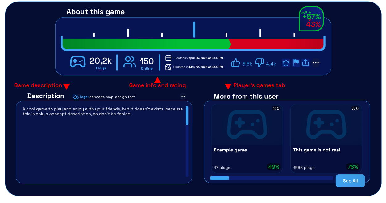 Game info and rating: That’s indeed the most part of the reason i’ve begun to create these concept ideas, and mostly when i saw such a basic initial design for this tab available in website, and wanted to display a design idea for it. The main “attraction” here can be seen when looking at the rating bar right above everything, which like the Roblox one (also where i got the inspiration for this) you can see the rating percentage according to likes or dislikes, and view what is going on with your game in that regard.